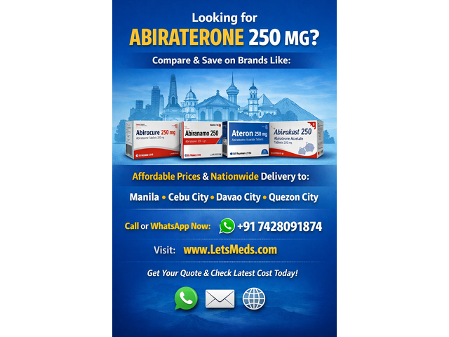 LetsMeds helps patients across the Philippines compare and access branded and generic options like Abiracure, Abiranamo 250 mg, Ateron, and Abirakast at competitive rates. If you’re checking the abiraterone price in Philippines or the abiraterone 250 mg price Philippines, it’s always smart to compare prices first. Availability and costs can vary between pharmacies in Manila, Cebu City, Davao City, and Quezon City.
