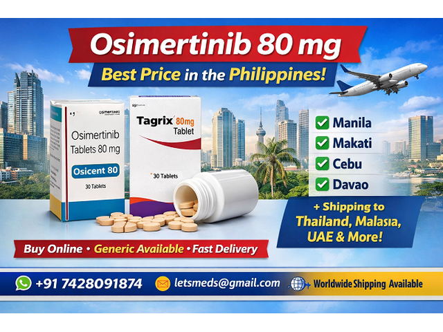 Get best prices on Osimertinib price Philippines with reliable suppliers offering genuine medicines. Check the latest Osimertinib 80 mg price and save more with affordable generic versions. You can now buy Osimertinib 80 mg online safely and conveniently from Letsmeds Pharmaceuticals Exporter and Supplier.. Our competitive Osimertinib generic price makes treatment more accessible for patients. We deliver across the Philippines including Makati, Manila, and Davao, plus international shipping to Thailand, Malaysia, UAE, and more. To place your order or check updated prices, call or WhatsApp +91 7428091874 or email letsmeds@gmail.com.