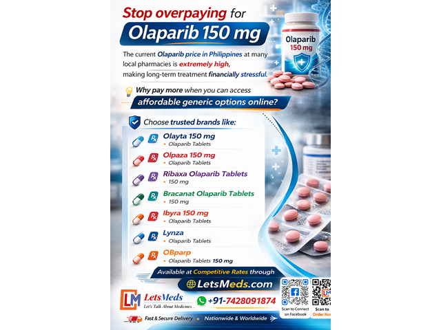 Stop overpaying for Olaparib 150 mg. The current Olaparib price in Philippines at many local pharmacies is extremely high, making long-term treatment financially stressful. Why pay more when you can access affordable generic options online? Choose trusted brands like Olayta 150 mg, Olpaza 150 mg, Ribaxa Olaparib Tablets, Bracanat Olaparib Tablets, Ibyra 150 mg, Lynza, and OBparp at competitive rates through https://www.letsmeds.com/ .