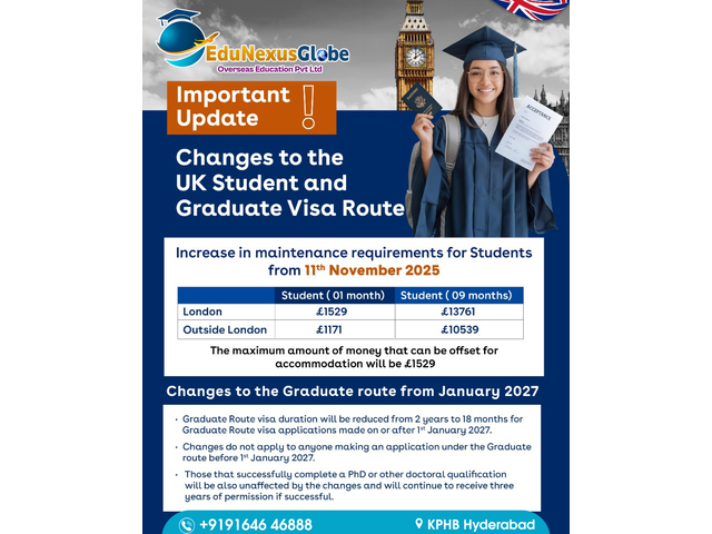 The United Kingdom has recently announced significant updates to its Student and Graduate Visa Route, which will take effect from 11th November 2025 and 1st January 2027. These changes are crucial for all students planning to study in the UK, as they impact both the financial requirements for visa applications and the duration of post-study work opportunities. EduNexus Globe is here to help students understand these changes and guide them through every step of the updated process with clarity and confidence.