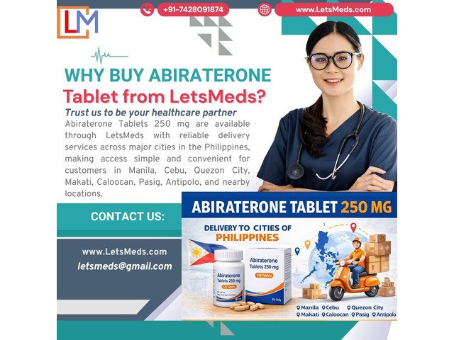 Abiraterone Tablets 250 mg are offered by LetsMeds with dependable delivery services to major cities across the Philippines, including Manila, Cebu, Quezon City, Makati, Caloocan, Pasig, Antipolo, and surrounding areas. LetsMeds ensures a convenient ordering process, secure packaging, and reliable international shipping to provide a smooth purchasing experience. For information about pricing, availability, or delivery support, customers can contact +91-7428091874 or email letsmeds@gmail.com