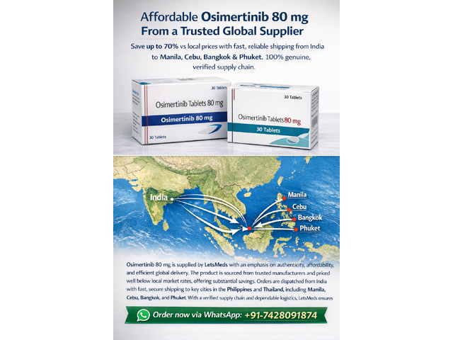 Osimertinib 80 mg Tablet is offered in the Philippines by LetsMeds with a strong focus on affordability and reliable supply. Sourced from trusted manufacturers, it is shipped securely from India to key cities such as Manila, Cebu, Davao, Quezon City, Makati, and Pasig. With a verified supply chain and efficient delivery network, LetsMeds ensures a smooth and dependable ordering process. For pricing and orders, connect via WhatsApp at +91-7428091874.