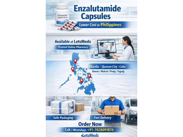 Enzalutamide Capsules available at lower cost in the Philippines through LetsMeds. Genuine quality, safe packaging, and reliable delivery across major cities including Manila, Quezon City, Cebu, Davao, Makati, Pasig, and Taguig. Order easily from a trusted online pharmacy with nationwide coverage and customer support. For price details and orders, call or WhatsApp +91-7428091874. LetsMeds – reliable access to affordable healthcare.