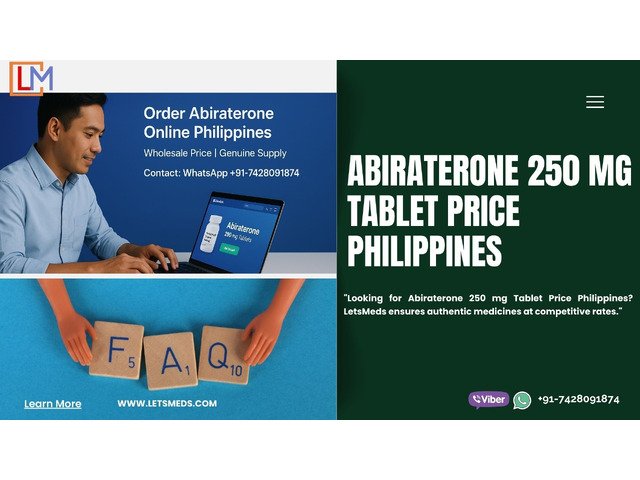 Looking for affordable Abiraterone 250 mg Tablets in the Philippines? LetsMeds Pharmaceuticals offers genuine, high-quality Abiraterone at wholesale prices sourced directly from certified Indian manufacturers. We provide fast and secure delivery to major cities such as Metro Manila, Quezon City, Cebu City, Davao, Zamboanga, Makati, Iloilo, and Bacolod. Each order is securely packaged and thoroughly verified for authenticity. Get reliable service, transparent pricing, and quick delivery in 5–10 business days. Contact us today on WhatsApp/Viber at +91-7428091874 or visit www.letsmeds.com