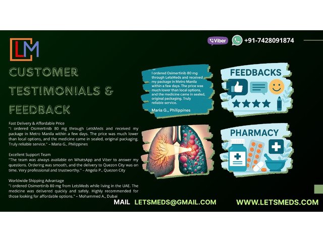 Buying Osimertinib 80mg tablets in the Philippines is now more convenient with LetsMeds. Maraming pasyente ang naghahanap ng abot-kayang presyo ng gamot na ito, and LetsMeds makes sure na makukuha mo ito nang mabilis, safe, at siguradong genuine. We deliver across Metro Manila, Quezon City, Cebu, Davao, at iba pang lungsod, ensuring patients receive their medicine on time. For inquiries or to place an order, you can contact LetsMeds through WhatsApp/Viber: +91-7428091874, or reach us on Skype/WeChat: LetsMeds. With LetsMeds, you get affordable Osimertinib 80mg plus maaasahang serbisyo at compassionate support every step of the way.