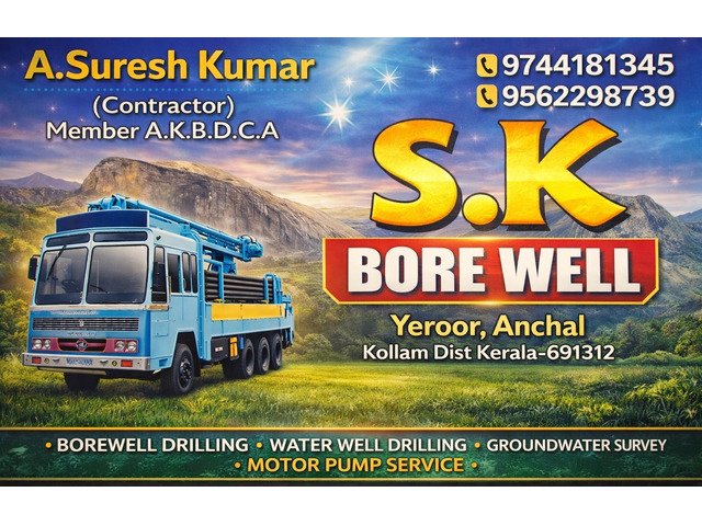SK Borewell is one of the most reliable and experienced borewell contractors in Anchal Kollam. We provide professional borewell drilling works, water well drilling works, and groundwater survey services for residential, commercial, and agricultural needs. With advanced equipment and skilled technicians, we ensure efficient and long lasting water solutions across Kollam district.