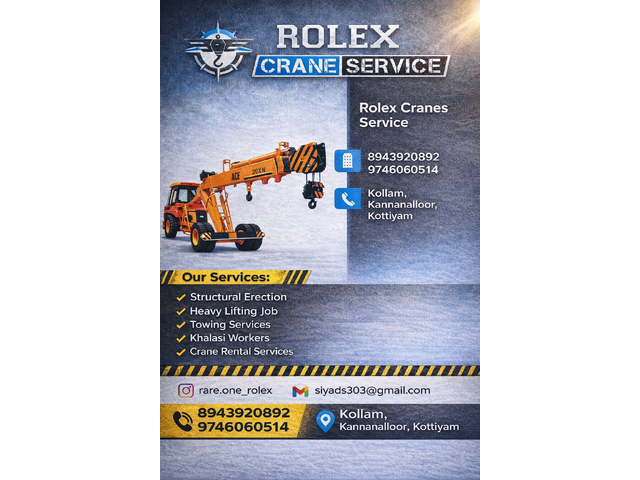 ROLEX CRANE SERVICE is a trusted name for professional crane service and vehicle recovery assistance in Kollam. From roadside emergencies to heavy lifting operations, our experienced team provides fast response and safe handling. We operate from Kottiyam and reach every nearby town without delay. Whether it is a small vehicle breakdown or a large construction lifting job, we arrive prepared with the right equipment and trained workers.