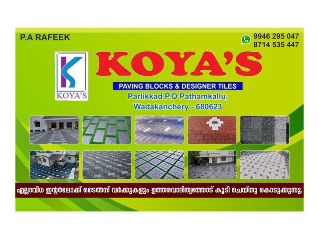 Looking for high-quality interlock tiles and paving block services in Thrissur? Welcome to KOYA'S PAVING BLOCKS & DESIGNER TILES, your trusted partner for premium flooring solutions, natural stone works, and professional interlock laying services.