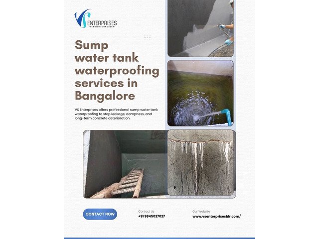 VS Enterprises provides reliable and long-lasting Sump Water Tank Waterproofing Services in Bangalore, ensuring clean, leak-proof, and contamination-free water storage solutions for residential and commercial properties. We use advanced waterproofing chemicals, crack filling techniques, and protective coatings to prevent leakage, seepage, and structural damage in underground and overhead sump tanks. Our services focus on stopping water loss, preventing dampness around foundations, and protecting concrete from corrosion and bacterial growth. We ensure that the lifespan of your water tank is extended and that hygiene standards are maintained with the expertise of our professionals and quality materials. Contact us today for expert sump waterproofing solutions and to ensure safe, secure water storage for your property.
